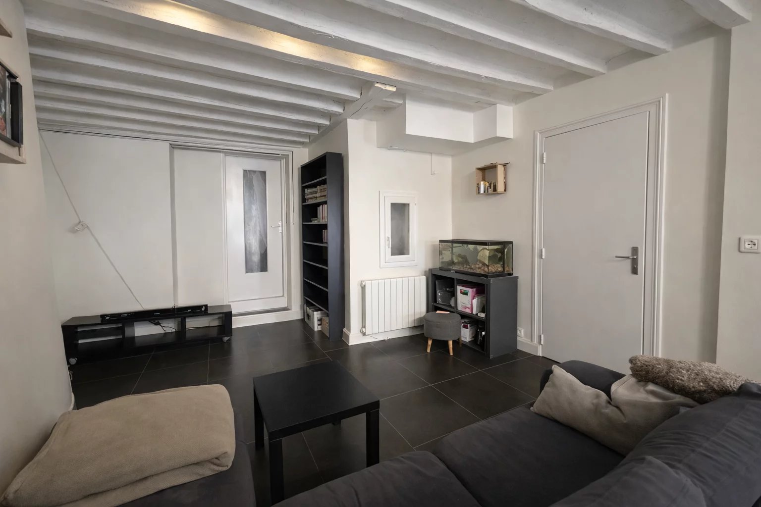 Cuisine aménagée ouverte sur pièce de vie, salle d’eau avec WC, une chambre.